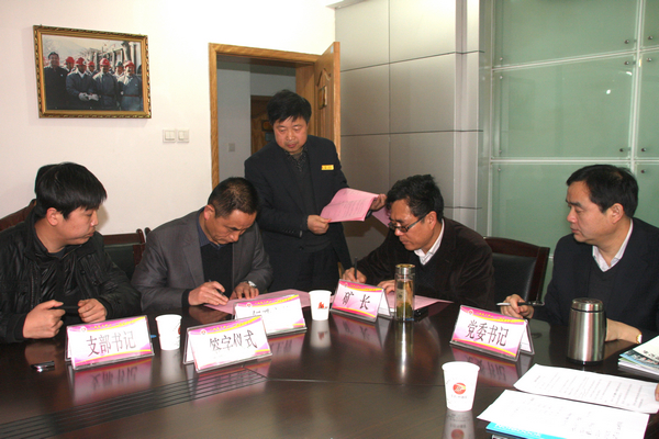 為了進一步加強黨風(fēng)廉政建設(shè),構(gòu)建平安穩(wěn)定和諧礦區(qū),3月12日,下石節(jié)煤機關(guān)二樓會議室里,該礦礦礦長李文輝,黨委書記李國璧,紀委書記李俊輝分別與基層各單位行政主管,支部書記簽訂了《黨風(fēng)廉政建設(shè)目標(biāo)責(zé)任書》和《平安穩(wěn)定和諧礦區(qū)建設(shè)目標(biāo)責(zé)任書》。責(zé)任書中明確了工作目標(biāo)、責(zé)任、以及考核獎憑辦法,促使各級干部嚴格按照目標(biāo)責(zé)任書要求,恪守職責(zé),嚴以自律,為促進礦區(qū)穩(wěn)定和諧健康發(fā)展,各項工作有序進行夯實了基礎(chǔ)。