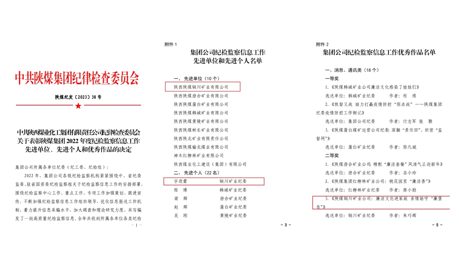 近日,陜煤集團紀委印發(fā)《關(guān)于表彰2022年度紀檢監(jiān)察信息工作先進單位、先進個人和優(yōu)秀作品的決定》,公司被評為“紀檢監(jiān)察信息工作先進單位”,1名紀檢同志被評為先進個人。由公司紀委報送的《陜煤銅川礦業(yè)公司:廉潔文化進家庭 親情助守“廉堡壘”》《陜煤銅川礦業(yè)柴家溝井:在推進廉潔文化中鎖定目標找準奮進坐標》分別榮獲消息類、通訊類二、三等獎。