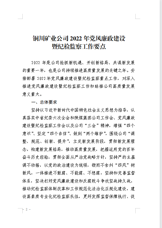 關(guān)于印發(fā)《銅川礦業(yè)公司2022年黨風廉政建設暨紀檢監(jiān)察工作要點》的通知