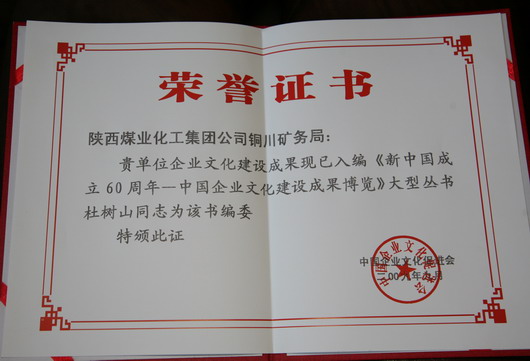 全國企業(yè)文化的盛會——“2009年全國企業(yè)文化建設(shè)工作年會暨第四屆會員代表大會”,10月29日至10月31日在山西太原召開,我局當(dāng)選為理事單位,杜樹山書記當(dāng)選為理事,礦務(wù)局被樹為全國企業(yè)文化建設(shè)“百佳”貢獻(xiàn)單位,局黨委書記杜樹山被評為“全國企業(yè)文化建設(shè)貢獻(xiàn)人物”,由杜書記任編委的《新中國成立60周年——中國企業(yè)文化建設(shè)成果博覽》大型叢書出版發(fā)行,銅川局企業(yè)文化建設(shè)成果入編此書。