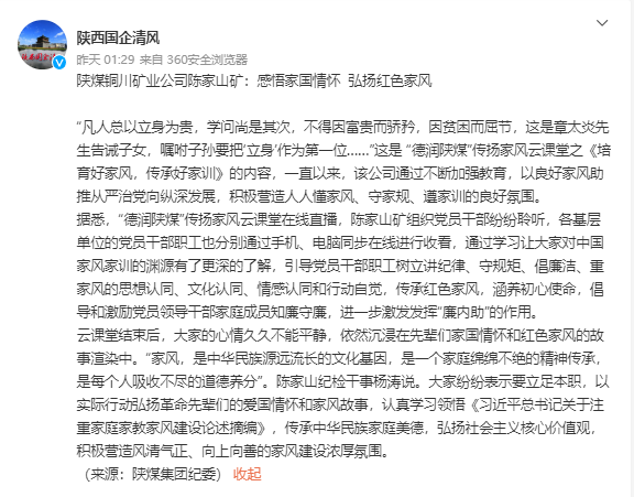 據(jù)悉,“德潤陜煤”傳揚(yáng)家風(fēng)云課堂在線直播,陳家山礦組織黨員干部紛紛聆聽,各基層單位的黨員干部職工也分別通過手機(jī)、電腦同步在線進(jìn)行收看,通過學(xué)習(xí)讓大家對(duì)中國家風(fēng)家訓(xùn)的淵源有了更深的了解,引導(dǎo)黨員干部職工樹立講紀(jì)律、守規(guī)矩、倡廉潔、重家風(fēng)的思想認(rèn)同、文化認(rèn)同、情感認(rèn)同和行動(dòng)自覺,傳承紅色家風(fēng),涵養(yǎng)初心使命,倡導(dǎo)和激勵(lì)黨員領(lǐng)導(dǎo)干部家庭成員知廉守廉,進(jìn)一步激發(fā)發(fā)揮“廉內(nèi)助”的作用。