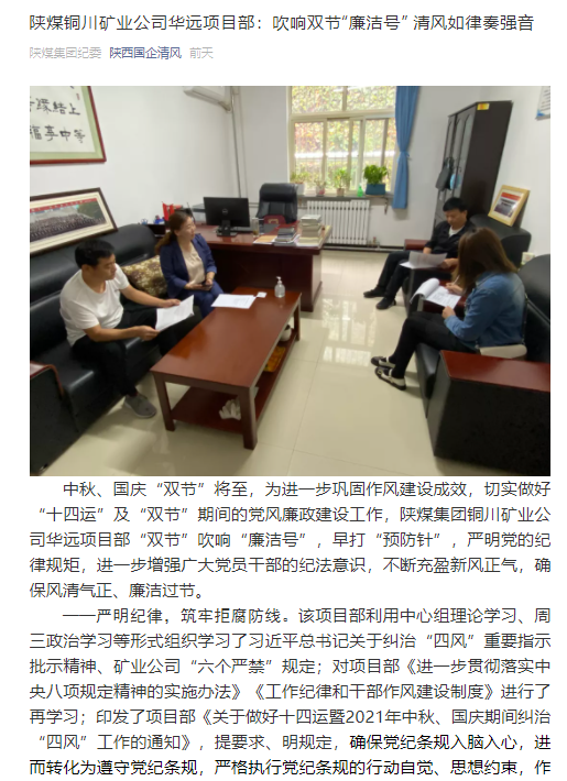 中秋、國(guó)慶“雙節(jié)”將至,為進(jìn)一步鞏固作風(fēng)建設(shè)成效,切實(shí)做好“十四運(yùn)”及“雙節(jié)”期間的黨風(fēng)廉政建設(shè)工作,銅川礦業(yè)公司華遠(yuǎn)項(xiàng)目部“雙節(jié)”吹響“廉潔號(hào)”,早打“預(yù)防針”,嚴(yán)明黨的紀(jì)律規(guī)矩,進(jìn)一步增強(qiáng)廣大黨員干部的紀(jì)法意識(shí),不斷充盈新風(fēng)正氣,確保風(fēng)清氣正、廉潔過(guò)節(jié)。