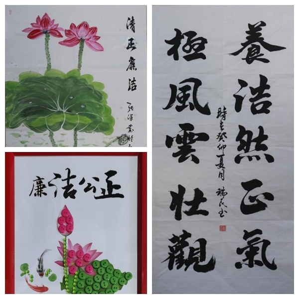 活動中,礦井職工各顯神通,有的寫書法,有的做手工,有的畫水墨畫。“養(yǎng)浩然正氣 極風(fēng)云大觀 ”,“廉潔公正”。共征集主題鮮明、富有創(chuàng)意作品50余幅。通過發(fā)現(xiàn)“廉文化”,贊美“廉文化”,弘揚“廉文化”,從不同維度表達、傳播“廉為榮,貪為恥”的廉潔理念,展現(xiàn)了新時代崇廉尚潔、健康向上的精神風(fēng)貌。