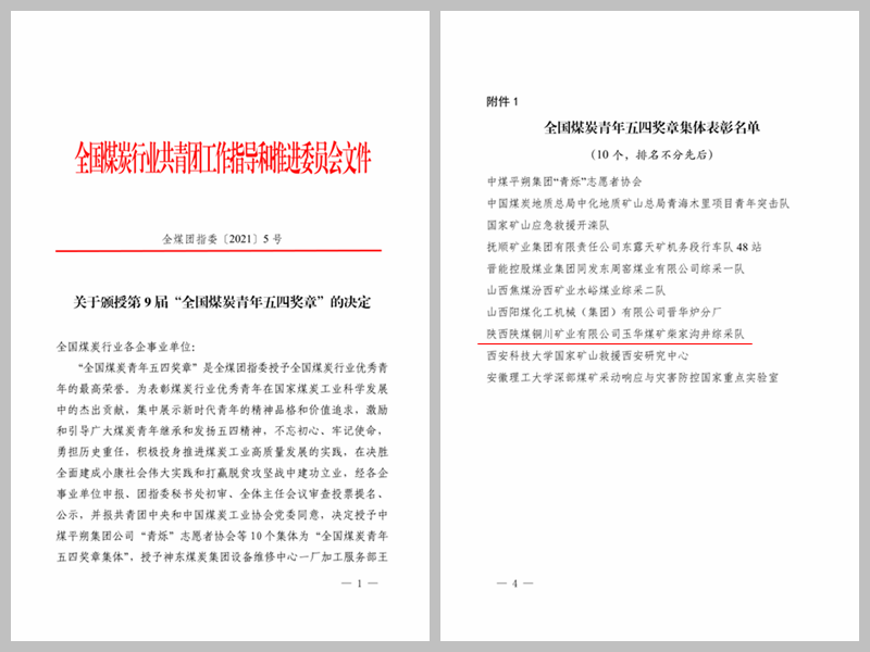 4月15日,由全國煤炭行業(yè)共青團工作指導(dǎo)和推進委員會舉辦的全國煤炭行業(yè)五四表彰大會暨“煤企百年跟黨走”主題團日活動在江西宜春舉行,大會頒授了第 9 屆“全國煤炭青年五四獎?wù)隆保碚们嗄曛械膬?yōu)秀典型和模范代表。公司柴家溝井綜采隊榮獲“全國煤炭青年五四獎?wù)录w”榮譽稱號。