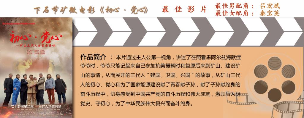 其中微電影《初心·黨心》以銅川礦區(qū)礦工三代奉獻(xiàn)礦山的事跡為創(chuàng)作背景,圍繞傳承紅色基因,賡續(xù)精神血脈,通過(guò)對(duì)礦山三代人家國(guó)情懷的生動(dòng)展示,深刻詮釋了銅煤人以初心鑒黨心,薪火相傳、奮斗創(chuàng)業(yè)的堅(jiān)定信仰和獻(xiàn)了青春獻(xiàn)子孫,獻(xiàn)了子孫獻(xiàn)終身的感人事跡。該作品憑借題材創(chuàng)意新穎、故事內(nèi)容感人、質(zhì)量效果上乘,一舉奪得“最佳影片”“最佳男配角”“最佳女配角”三項(xiàng)大獎(jiǎng)。