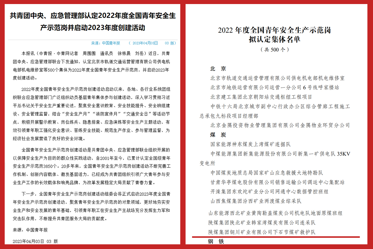 近日,共青團(tuán)中央、應(yīng)急管理部聯(lián)合下發(fā)《關(guān)于認(rèn)定2022年度全國青年安全生產(chǎn)示范崗的通知》,公司下石節(jié)礦救護(hù)隊(duì)獲評(píng)全國青年安全生產(chǎn)示范崗稱號(hào)。此次評(píng)定500家單位中,陜西省共有19個(gè)集體獲此殊榮,其中煤炭行業(yè)2個(gè),公司下石節(jié)礦救護(hù)隊(duì)作為其中之一光榮上榜。