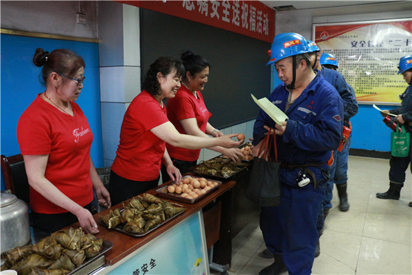 “師傅,端午節(jié)快樂!吃個粽子吧”,“天氣熱了,大家喝杯降溫茶,注意防暑!”,“祝您節(jié)日快樂!井下要注意安全??!”……,6月7日,適逢端午佳節(jié),又是全國第18個“安全生產(chǎn)月”活動火熱開展之際,玉華煤礦候罐大廳里迎來一群“特殊客人”,家屬安全協(xié)管員和團員青年志愿者為即將下井工作的職工們送來了香氣四溢的粽子和飽含親情的安全叮囑。