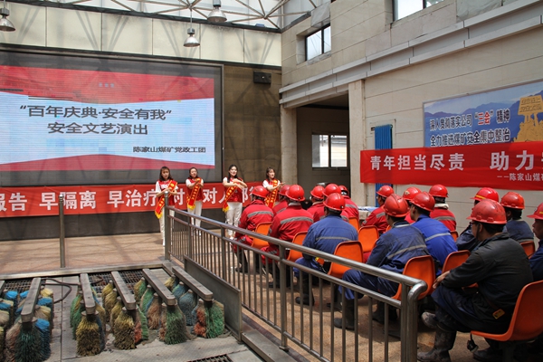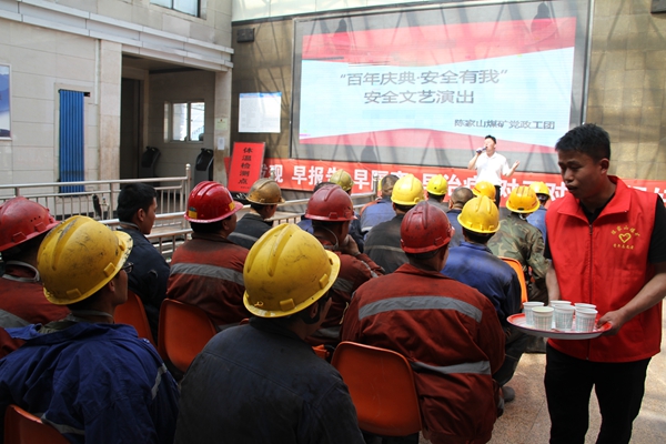 為在“安全月”中營造濃厚的安全生產氛圍,豐富職工文化生活,動員一線職工戰(zhàn)高溫、斗酷暑,打好安全攻堅戰(zhàn),陳家山礦在井口開展“送清涼送文藝井口”活動,為高溫下堅守崗位的一線職工送去“清涼茶”和精彩的文藝演出?;顒蝇F(xiàn)場,伴隨著優(yōu)美的歌聲中,該礦團委還為職工們送去了“綠豆湯”,把無微不至的關愛送到職工的手中、心上。