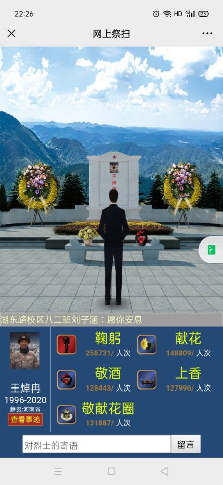 大家通過登錄中華先烈網(wǎng)“網(wǎng)上祭英烈”專區(qū),參加形式多樣的網(wǎng)上祭掃,進(jìn)行網(wǎng)上獻(xiàn)花、網(wǎng)上留言、網(wǎng)上祭奠等活動,寄托對革命先輩無盡的哀思,表達(dá)對革命先烈由衷的崇敬,抒發(fā)傳承先烈革命精神,為實現(xiàn)民族復(fù)興“中國夢”而不懈奮斗。