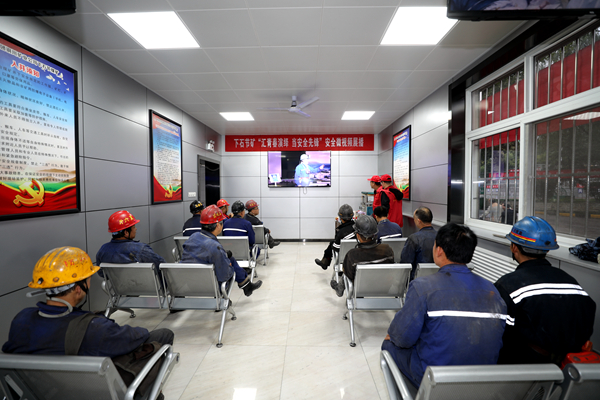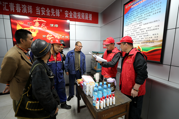 同一時間,該礦井口安全教育室的電視大屏上滾動播出的《安全“救”在身邊》《一念之間》《你“安”家才“全”》等幾期安全微視頻也深受一線干部職工的歡迎。青年志愿者一邊為準(zhǔn)備入井和剛剛升井的職工端上一杯安全茶水,招呼大家一起觀看,隨后開展安全知識有獎問答活動,讓大家在看中學(xué),在學(xué)中悟,積極將安全理念牢記于心,落實于行。