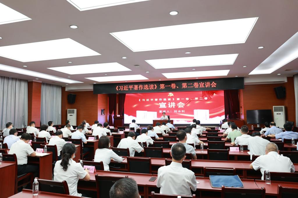 宣講中,劉水利從“深刻認(rèn)識《習(xí)近平著作選讀》出版發(fā)行的重大意義、準(zhǔn)確把握《習(xí)近平著作選讀》的豐富內(nèi)涵和精神實質(zhì)、學(xué)習(xí)領(lǐng)會《習(xí)近平著作選讀》的主要篇目、不斷把學(xué)習(xí)宣傳貫徹《習(xí)近平著作選讀》引向深入”四個方面,以深入淺出、準(zhǔn)確生動的語言,對《習(xí)近平著作選讀》第一卷、第二卷進行了宣講解讀。