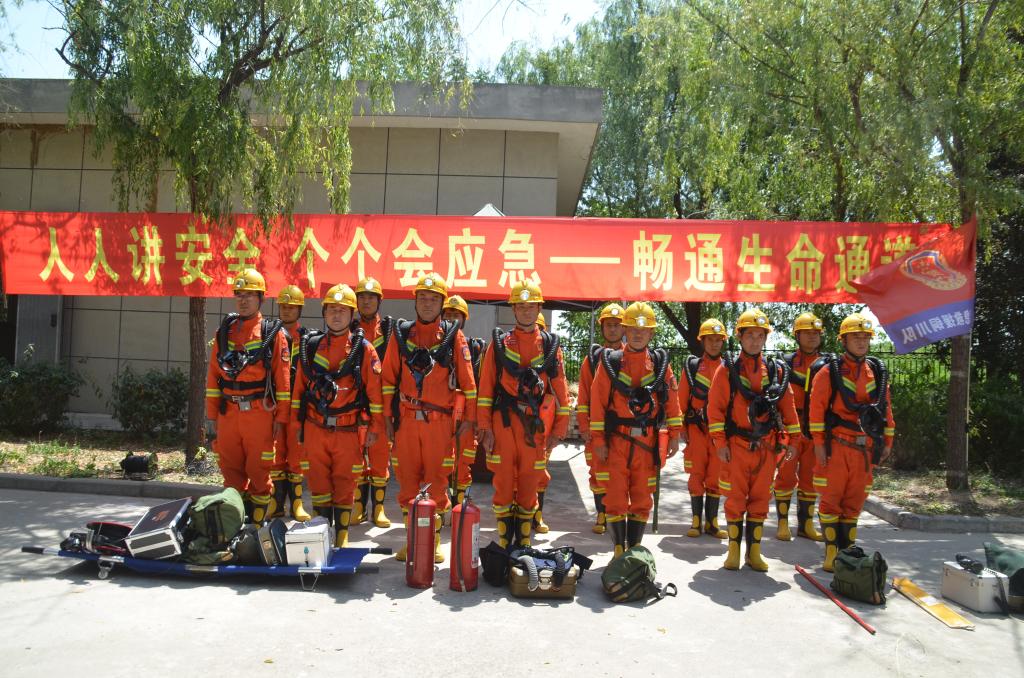 烈日如火,濃煙彌漫,在氣溫高達(dá)38℃的炎熱氣候下,他們身著戰(zhàn)斗服,佩戴沉重的正壓氧氣呼吸器和全面罩,迅速集結(jié)在模擬巷道入口,正在進(jìn)行一場模擬礦井火災(zāi)的高溫濃煙實(shí)戰(zhàn)演習(xí)。