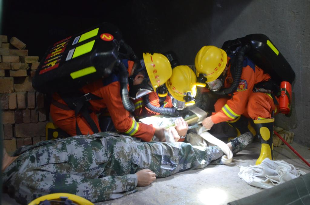 演練過程中,指戰(zhàn)員們充分發(fā)揚(yáng)特別能吃苦、特別能奉獻(xiàn)、特別能戰(zhàn)斗的精神,憑借極大的意志力和專業(yè)救援能力,在規(guī)定時間內(nèi)圓滿完成災(zāi)區(qū)偵察、搬運(yùn)傷員、建造木板密閉墻、安裝局部通風(fēng)機(jī)等所有演習(xí)科目。