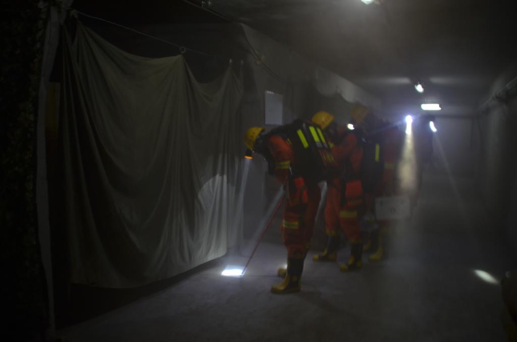 戰(zhàn)前檢查完畢后,隨著現(xiàn)場指揮員的一聲令下,救援小組背負(fù)著15公斤重的呼吸器和救援裝備快速進(jìn)入巷道。巷道內(nèi)濃煙滾滾,熱浪襲人,溫度高達(dá)45度以上,指戰(zhàn)員們頂著高溫?zé)崂撕蜆O低能見度環(huán)境快速展開救援。