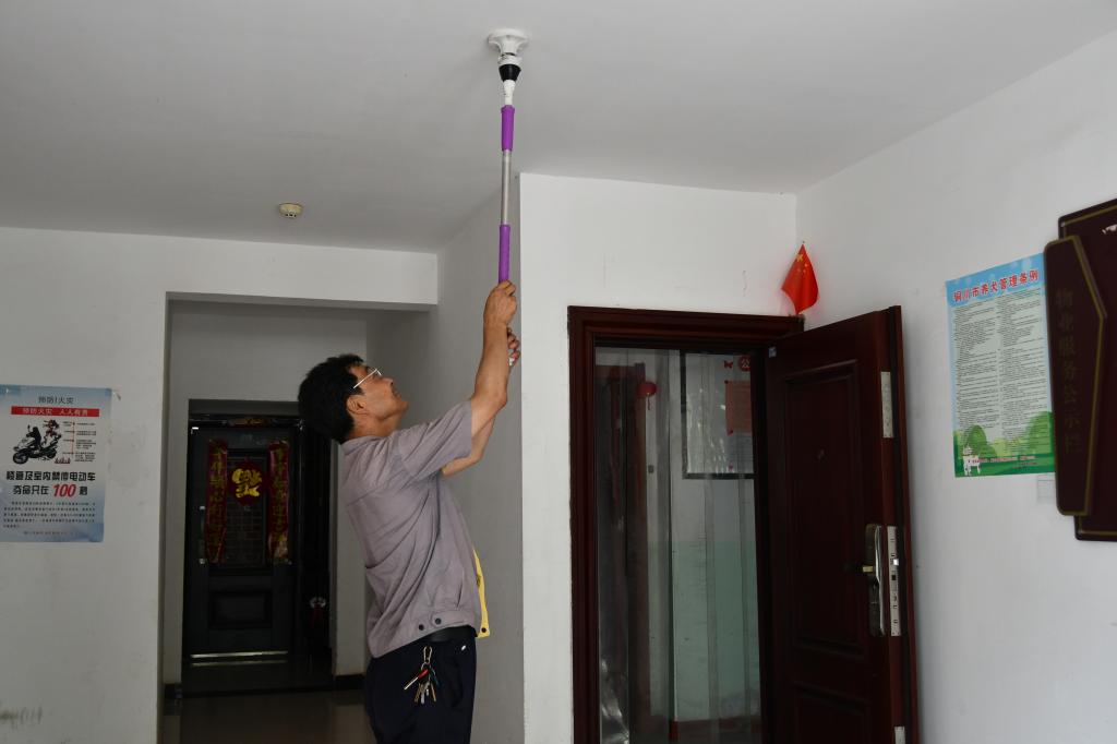 “過去換燈泡,扛梯子、爬高、小心翼翼,一個(gè)活下來汗流浹背不說,效率還低。”維修部工作人員道出了工作中的難點(diǎn)。面對(duì)這個(gè)看似尋常卻存在安全隱患、消耗人力的難題,物業(yè)團(tuán)隊(duì)沒有選擇申請(qǐng)經(jīng)費(fèi)購置設(shè)備,而是想方設(shè)法精打細(xì)算,資源挖潛?!拔覀冏聊ブ懿荒懿换ㄥX,或者花最少的錢解決它?”帶著這個(gè)樸素的想法,維修工們化身“發(fā)明家”,他們翻找倉庫角落,利用廢棄拖把的伸縮桿加上礦泉水瓶子剪掉一半,剛好能放進(jìn)去節(jié)能燈泡,礦泉水瓶外部纏電工膠帶進(jìn)行絕緣,內(nèi)部貼有雙面膠及電工膠帶,增大摩擦力,抓握燈泡,更換燈泡時(shí)不用梯子,直接將前端伸向壞掉的燈泡,擰下進(jìn)行更換。整個(gè)制作過程,幾乎沒有產(chǎn)生新的物料采購費(fèi)用,真正實(shí)現(xiàn)了“變廢為寶”。這個(gè)“換燈神器”設(shè)計(jì)通過反復(fù)調(diào)試、動(dòng)手組裝,全部由維修團(tuán)隊(duì)利用工余時(shí)間完成,這省出來的每一分錢,都是對(duì)過“緊日子”理念的見行見效。