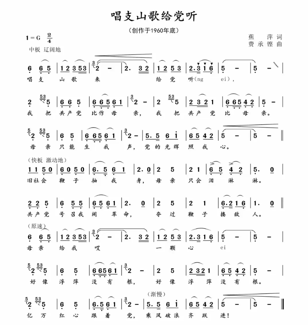 費承鏗先生是個務(wù)實的人,他肯定認為創(chuàng)作于“大躍進”時期的不少歌曲不符合事實和文藝創(chuàng)作規(guī)律,正因為“蕉萍”這首歌頌“大躍進”歌詞較為含蓄,且本質(zhì)上是歌頌共產(chǎn)黨、歌頌新社會的,所以費承鏗先生為《唱支山歌給黨聽》歌詞進行了譜曲。遺憾的是,當費承鏗先生于1960年譜成《唱支山歌給黨聽》一歌時,國家正叫?!按筌S進”,因此,費承鏗先生創(chuàng)作的《唱支山歌給黨聽》一出生便被打入了“冷宮”。直到吳躍華教授在整理費教授遺物時才發(fā)現(xiàn)了這首歌。