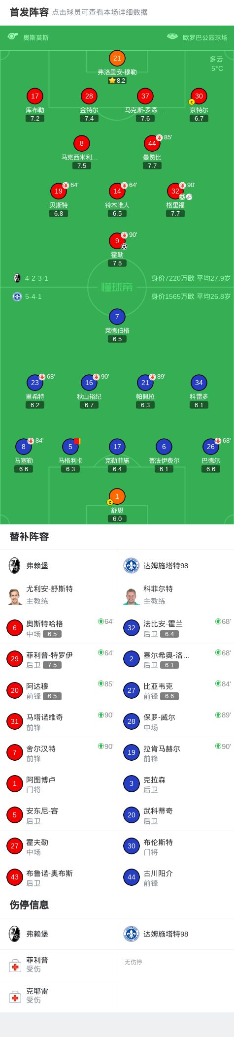 弗賴堡2-0達姆施塔特98,格里福破門,霍勒鎖定勝局